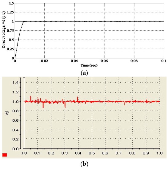 The comparison of controller parameters between the simulation and the experiment are displayed from Figure 14, Figure 15 and Figure 16. In Figure 14, the direct voltage component, vd, of both the simulation and experiment are in conformance with each other. It is observed that it has a well-controlled steady-state response, except during the period of zero to 0.4 s. Nevertheless, the parameter is well tracked and regulated at the level of 1 p.u. as anticipated in the simulation.
