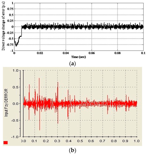 Like the direct voltage, the quadrature voltage, vq, for both the simulation and experiment show similar characteristics of zero-voltage tracking capability. This can be seen in Figure 15, whereby the controller is capable of regulating the parameter at the zero level very accurately. As for the “change of error” parameter, Figure 16 depicts the controller vd “change of error” waveforms for the simulation and experiment. It is noticed that the controller manages to regulate the change of error to a very minimum level (zero level) during the operation. This implies the significance of the inverter output voltage regulation characteristic.