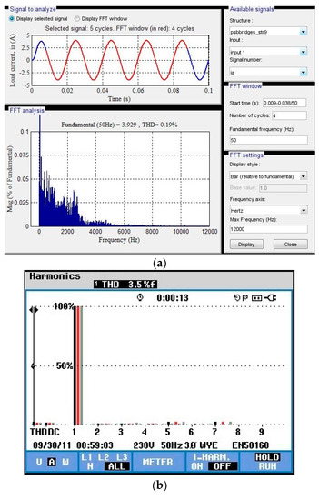Total harmonic distortion (THD) of the load current of the (a) simulation and (b) experiment.