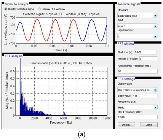 The harmonics are produced from the voltage value, which are noticed as sidebands, centered around the switching frequency, and its multiple, as expressed in Equation (8) [29]. Nevertheless, a nearly sinusoidal-shaped output waveform is achieved with the help of an appropriate filter. This filter operates as high impedance and low impedance for higher order frequency and lower order frequency, respectively. Hence, the cutoff frequency is usually set at 1 or 2 times higher than the fundamental frequency, which is 200 Hz [30].