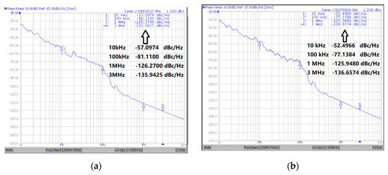 As stated above, the resolution was about 7.3 kHz at a carrier of 2.4 GHz. The resulting phase noise was about −131 dBc/Hz at 1-MHz offset when a 50-MHz reference is used, according to Equation (2). When the DCO works at 2.5 GHz, substituting a 9 kHz resolution into Equation (2), we can obtain −129 dBc/Hz at 1-MHz offset. The measured phase-noise plots of the proposed DCO operating at a low- and high-frequency are shown in Figure 12. As shown in Figure 12a,b (at a 0.6-V supply), at a 2.4-GHz carrier, the measured results were −57.0974 dBc/Hz at 10 kHz offset, −81.11 dBc/Hz at 100 kHz offset, −126.27 dBc/Hz at 1-MHz offset, and −135.9425 dBc/Hz at 3-MHz offset. At a 2.5-GHz carrier, the measured results were −52.4966 dBc/Hz at 10 kHz offset, −77.1384 dBc/Hz at 100 kHz offset, −125.9480 dBc/Hz at 1-MHz offset, and −136.6574 dBc/Hz at 3-MHz offset. The phase noise at a 2.5-GHz carrier was slightly weaker than that at 2.4 GHz, except at 3-MHz offset. As shown in Figure 12c,d (at a 0.5-V supply), at a 2.4-GHz carrier, the measured results were −52.1115 dBc/Hz at 10 kHz offset, −76.0526 dBc/Hz at 100 kHz offset, −122.2067 dBc/Hz at 1-MHz offset, and −130.8525 dBc/Hz at 3-MHz offset. At a 2.5-GHz carrier, the measured results were −46.5848 dBc/Hz at 10 kHz offset, −71.0387 dBc/Hz at 100 kHz offset, −120.7571 dBc/Hz at 1-MHz offset, and −130.0356 dBc/Hz at 3-MHz offset. Compared with the phase noise at a 0.6-V supply, the phase noise at a 0.5-V supply was deteriorated by an average of 5 dB due to the lower current and lower signal amplitude.