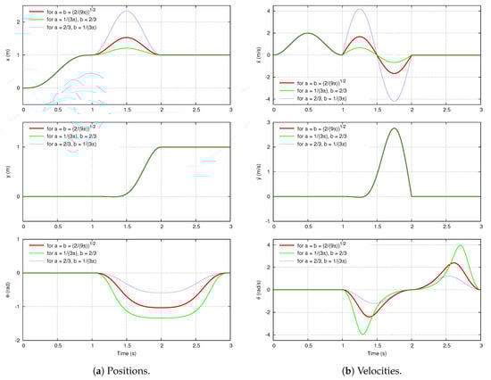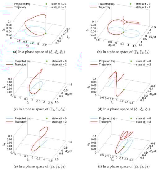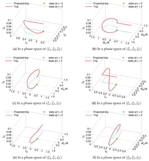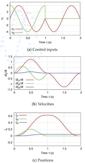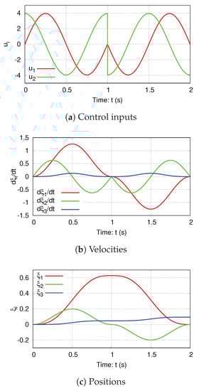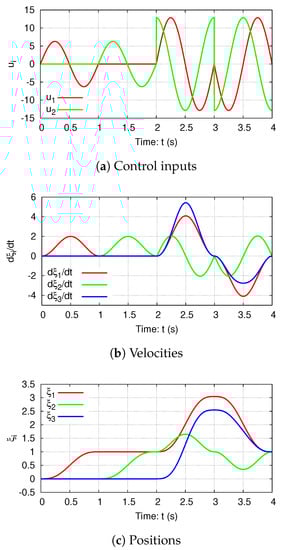 Figure 1 shows the control inputs with , the resultant velocities and positions. Also, Figure 2 depicts the trajectories in various phase spaces. Trajectories of velocities and positions were (not analytically but) numerically obtained. The simulator was developed in C with the GNU Scientific Library []. The embedded eight-th order Runge-Kutta Prince-Dormand method with nine-th order error estimate (rk8pd) was selected as an ODE solver, where an absolute and relative errors were set to and 0, respectively.