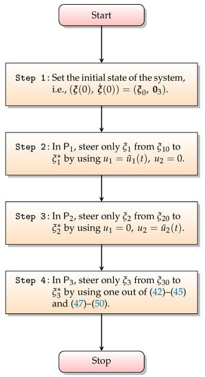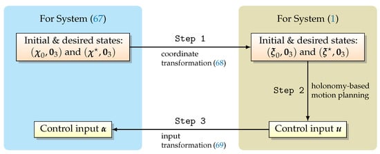 We here suppose a motion from to that is subject to . The correspondence between (67) and (1) implies that the system (67) with the input transformation (69) can be controlled by the motion planning algorithm presented in Section 3.3. Then, a control procedure for achieving such motion is as follows (see Figure 8 as the corresponding diagram):