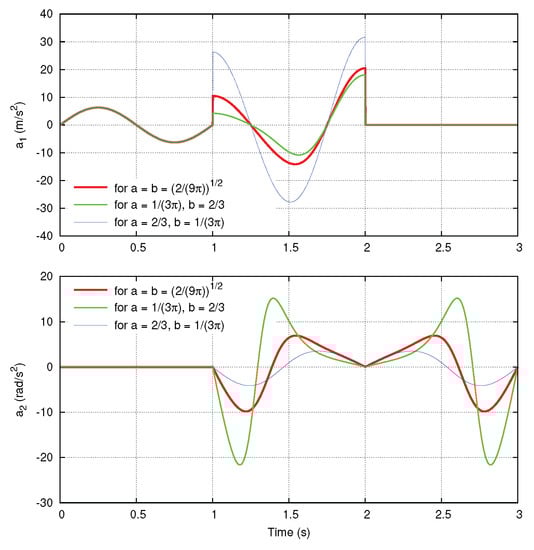 Let us consider that a three-joint underactuated manipulator with , , , , that is, conducts a rest-to-rest motion from to . Then, and correspond to and , respectively. The following set of control inputs to (1) can be applied: