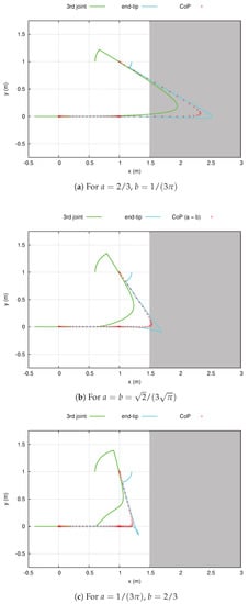 The last two facts indicate that the freedom in choosing and can be used for obstacle avoidance. If there is an obstacle in the gray-hatched area of Figure 11, choosing and such that is less than can make the third link avoid colliding to the obstacle. Therefore, the simulation results illustrated the effectiveness of the proposed algorithm.