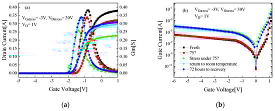 - Lee, J.M.; Min, B.G.; Ju, C.W. High temperature storage test and its effect on the thermal stability and electrical characteristics of AlGaN/GaN high electron mobility transistors. Curr. Appl. Phys. 2017, 17, 157–161. [Google Scholar] [CrossRef]