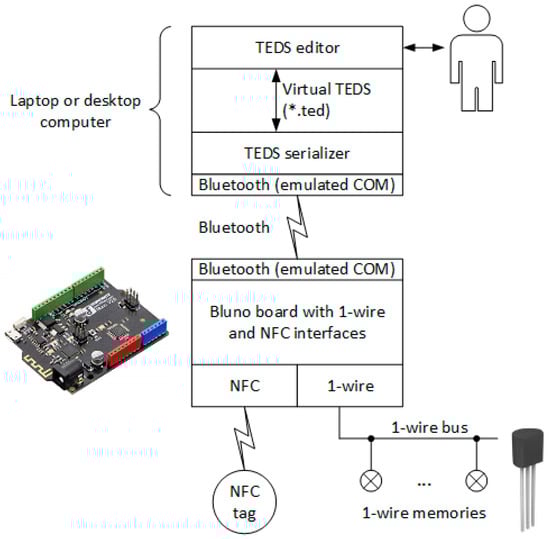 As shown in Figure 2, we added an NFC interface to the Bluno board, shield PN532 NFC/RFID controller from Adafruit [34]. The TEDS serializer and the Bluno firmware were upgraded to access NFC tags in addition to one-wire memories. Tests were made with the tag NTAG215 from NXP Semiconductors, with a capacity of 504 bytes = 4032 bits, similar to that of the DS24B33 memory.
