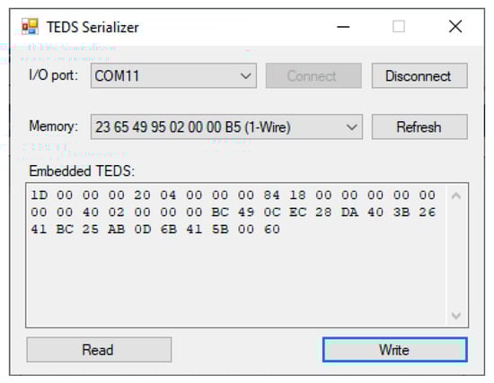 Figure 2 shows the data flow from the user to the embedded bit. Figure 3 shows the front end of the serializer, which includes controls to connect to the Bluno board and to select the target memory from the one-wire bus. The “Write” button opens a dialog box to choose the virtual TEDS whose content is dumped into the memory. The bit stream is shown as a hexadecimal string in the text box below. The inverse operation, i.e., read a one-wire memory and save the embedded TEDS as a virtual TEDS is also possible. Tests were made with the chip DS24B33, which is a one-wire EEPROM with 4096 bits, enough to store complex data structures including some space for user TEDS.