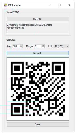 To create printed TEDS, we built a .NET application, named “QR encoder”, that takes a virtual TEDS and generates the corresponding QR code using the ZXing.Net library [37]. As shown in Figure 4, the encoder allows adjustments for image size, margin, and error correction level. The code version is chosen automatically to better accommodate the payload, which is encoded as an array of bytes. The output is a simple PNG image.