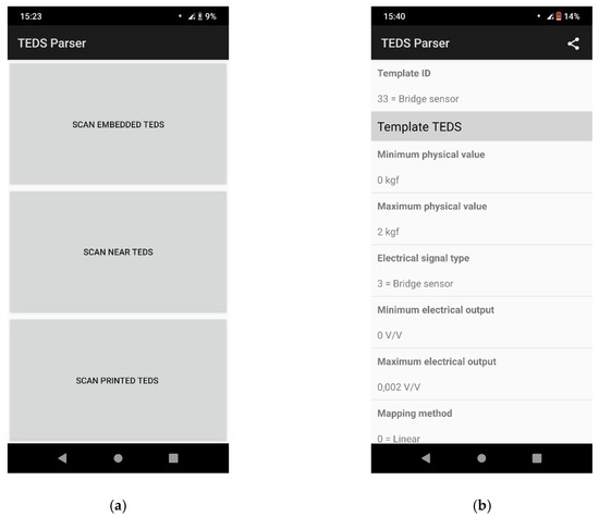 The mobile parser is a very useful tool to read TEDS anywhere, anytime. Our parser was written in C# using Visual Studio 2017 with Xamarin for Android [40] (minimum Android version = 4.1, API level 16—Jelly Bean; target Android version = 8.1, API level 27—Oreo). The parser runs on devices equipped with a cam (to capture QR codes), NFC interface (to read near TEDS), and Bluetooth (to read embedded TEDS).