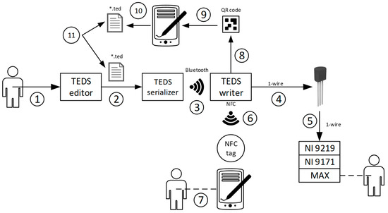 Dataflow through all the tools proposed to disseminate TEDS: (1) using the TEDS editor, the user defines manually the TEDS of the load cell; (2) the TEDS editor generates the corresponding virtual TEDS (binary file *.ted); (3) the TEDS serializer sends the bits of the virtual TEDS, one by one, through the Bluetooth interface to the TEDS writer; (4) the virtual TEDS are embedded into a one-wire memory; (5) the embedded TEDS are read by commercial equipment compatible with the 21451-4 standard, and the content is used to automatically configure the measurement chain; (6) the virtual TEDS can also be stored in a near field communication (NFC) tag; (7) the mobile parser reads the NFC tag and presents the TEDS as human-readable text; (8) the virtual TEDS can also be stored as a QR code; (9) the mobile parser scans the QR code and presents the TEDS as human-readable text; (10) the mobile parser serializes the TEDS to a binary file and sends it by email; (11) the files generated in steps (2) and (10) are equal, bit by bit, thus demonstrating the integrity of the data across the whole apparatus.