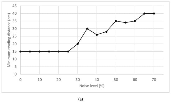 The minimum reading distance is about 15 cm, corresponding to the focal distance of the cam. Then we see that, generally, the minimum reading distance increases with the noise level, suggesting that distance behaves like a low-pass filter that attenuates the effect of the noise. Another interesting feature is the capability of the scanner to read QR codes with very high levels of noise, up to 70%, corresponding to a very distorted image (at least to the naked eye). QR codes with noise level equal or above 75% were unreadable. These results are a good indicator of the robustness of the printed TEDS.