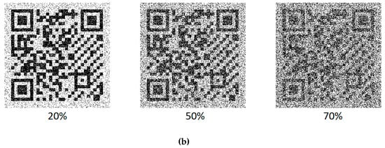 Readability of printed TEDS: (a) minimum reading distance versus noise level; (b) some QR codes distorted with salt-and-pepper noise.