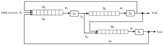The interconnections between the three servers show the path each job has to follow, in order to obtain the requested resources (or a portion of them). As shown in Figure 1, the jobs enter, initially, the DSQ and they leave the dominant resource provider, , in time represented by . After obtaining the dominant resource, the job either moves to  to request an amount of the second resource or moves to  to request an amount of the third resource. When the job gets the requested amounts of other resources, it can return to the DSQ if it needs additional dominant resources or its resource allocation terminates.
