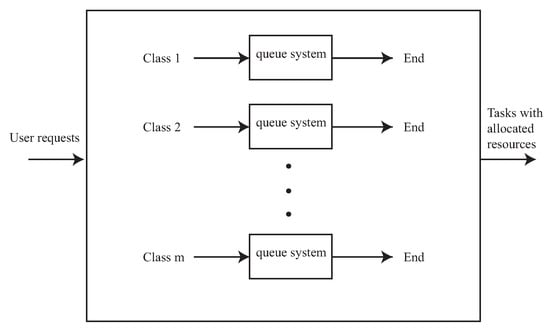 Our resource allocation scheme separates the user demands into classes, based on the dominant resource. Thus, there are m classes. The resource allocator is a central system that handles a set of queue systems. Generally, the resource allocator has m queue systems, with a structure similar to the one shown in Figure 1, one for each dominant resource. For , Figure 1 shows the structure of each queue system exactly. Figure 2 shows the general structure of the resource allocator.