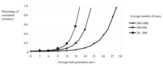 After running sets of simulations for different user numbers, we averaged the percentages of resources consumed during all the recorded time intervals, for different recorded values of . The results showed that, when the value of  increased up to the thresholds defined by Equation (7), the percentage of resources consumed during this interval increased, due to increased utilization. The results are shown in Figure 3. When the number of users is relatively small, an average value of  was enough to consume almost 100% of the resources during this period. For larger number of users (up to 1000), an average job generation rate of up to  (among all queues) was necessary to exhaust the resources requested over the time intervals.