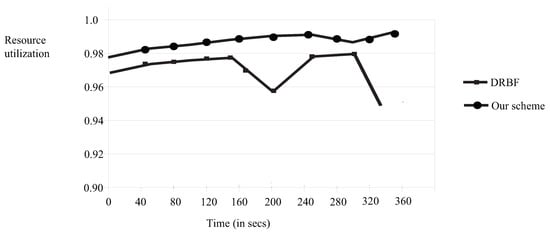 In our last set of experiments, we averaged the utilization of all (see Figure 5) the resources under our policy using a small number of users (up to 20), to fairly compare the utilization provided by our policy to the utilization provided by a new algorithm, DRBF [] (the authors present simulation results for a set of six users). From the results, we see that our policy outperforms the DRBF strategy and achieves utilization of about 98%–99%, while the changes are very small (notice that the line is rather smooth). The DRBF policy achieves a utilization of about 94%–98%, with some peaks where the utilization drops off in a non-smooth fashion. Additionally, note that our strategy was found to achieve a utilization of over 90%, even for a large number of users.