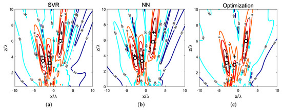 Example #1. Normalized near-field power density at for the support vector regression (SVR) method (a), the neural network in [14] (b) and the optimization in [13] using a non-coupling model (c). The symbols + and ∘ represent the focal and synthesized maximum points respectively.