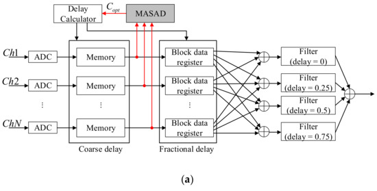 - Cho, J.; Lee, J.; Song, J.; Kim, Y.; Song, T. A fractional filter-based beamformer architecture using postfiltering approach to minimize hardware complexity. IEEE Trans. Ultrason. Ferroelectr. Freq. Control 2007, 54, 1076–1079. [Google Scholar] [CrossRef]