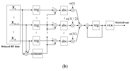 Figure 1a shows a block diagram of a conventional dynamic receive beamformer (DRB) based on fractional delay beamforming architecture [22] with the proposed MASAD block, which is shaded gray. Pre-beamformed RF channel data from analog-to-digital converter (ADC) were 12 bit, which is typically used in medical ultrasound imaging systems. The signal to quantization noise ratio (SQNR) of typical ultrasound RF data is 74 dB, which is defined by , where b is number of bits of ADC (i.e., 12 bit) [23]. The block diagram of the proposed MASAD is shown in Figure 1b. As shown in Figure 1b, the MASAD block can be implemented with N+2 register, N+2 adder, N absolute and N multiplier where N is the number of channels in the receive beamformer. To implement the proposed MASAD, input registers (pre-beamformed RF data), window coefficients and output register were 12 bits (12 integral bits), 8 bits (1 signed bit and 7 fractional bits) and 28 bits (21 integral bits and 7 fractional bits), respectively. Since we calculated the ASAD values without any truncation, the error between floating point calculation by PC and fixed point calculation by FPGA was less than 0.03%. The additional hardware for the MASAD block is not be a significant burden to the ultrasound imaging systems.