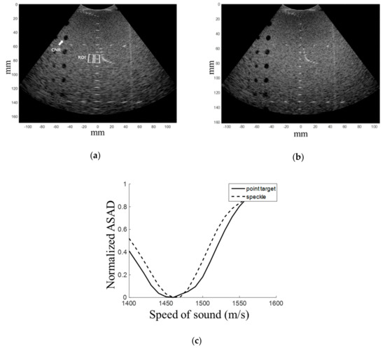 Experiment results of the homogeneous medium. B-mode image with a sound speed of (a) 1540 m/s, (b) 1460 m/s and (c) normalized ASAD values for the region of interest (ROI) of the point target (solid line) and speckle regions (dotted line).