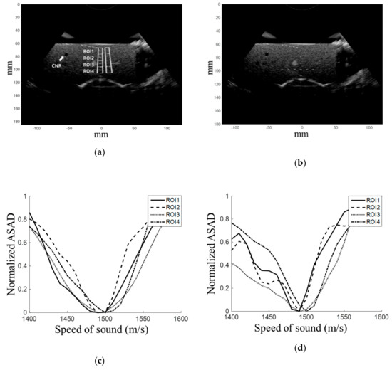 In vivo experiment results for the liver. B-mode image with sound speeds of (a) 1540 m/s and (b) 1580m/s, and (c,d) normalized ASAD values for the ROI. Cross-section of the vessel wall indicated by a dotted line in Figure 4a.