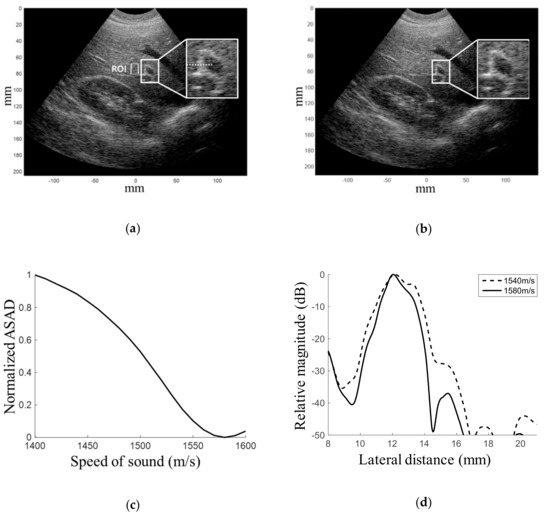 where N, L and K are the number of channels, scanlines and focal points per a scanline in the ROI, respectively. Xn (l, k) is the delayed RF data of the nth element for the kth focal point at the lth scanline in the ROI, Xmean (l, k) is the mean value of the delayed RF data and w(n) is the window function. The ROI can be set to around or beyond a transmit focusing point to minimize the effect from phase distortion in the near field. In the proposed estimation method, the pre-beamformed RF data in the ROI are first captured after freezing the image upon a user’s request. With an initial sound speed, the receive focusing delays are calculated using Equation (1). The focusing delays are applied to the captured RF data, and the average sum of the absolute difference (ASAD) in Equation (2) is computed. As indicated in Equation (2), the ASAD values are iteratively computed for the RF data in the ROI while changing the sound speed, and the sound speed providing the minimum ASAD (MASAD) value is determined as an optimal mean sound speed. Then, the estimated optimal mean sound speed is applied to subsequent real-time ultrasound beamforming to achieve the enhanced image quality.