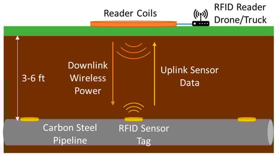 Proposed radio-frequency-identification tags (RFID) system sensor platform for communicating with buried pipelines. Typical sensors include temperature, moisture, and strain-gauge sensors that run from a 3 V supply.