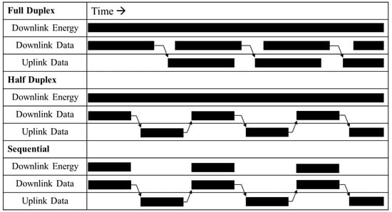 Diagram of full/half duplex and sequential RFID systems. Black bars indicate wireless transmission. Reproduced from [20].