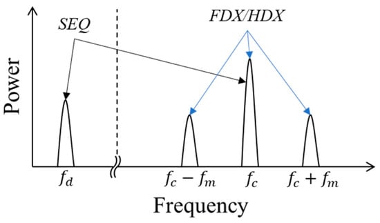 Power spectrum diagram for full/half duplex and sequential RFID systems. Downlink power transmission frequency is fc for full/half duplex (FDX/HDX) and sequential (SEQ) RFID systems. Uplink data frequency is fc ± fm for FDX/HDX and fd for SEQ RFID systems.
