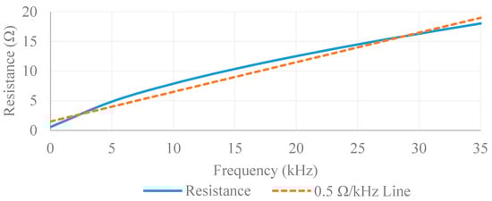 Conventionally, RFIDs using near-field magnetic inductions have operated in LF and HF bands for different applications as shown in [20]. HF bands (13.56 MHz) typically offer faster data rates compared to LF bands (~58–120 kHz) and also induce higher open circuit output voltage (Voc) on the tag coil albeit at the cost of higher current consumption by the tag. This can be seen from Equation (1) that shows a Voc increasingly linearly with the carrier frequency (fc). However, the tag’s input voltage (Vin–pk) is the coil open circuit voltage divided by the coil’s AC resistance (Rcoil) and input impedance of the tag’s rectifying and voltage-multiplying charge pump circuit (Rtag) as shown in Equation (2a). The coil’s AC resistance is given by Equation (2b) below and shows an increase by a factor of 12 from LF to HF bands [21]. The coil’s AC resistance (Rcoil) is further increased due to proximity effects of the carbon steel pipe, which was characterized using a BK Precision 895 impedance analyzer for a 0.07 m radius and 55-turn coil made using 435 strands of 40 AWG (strand radius a = 0.08 mm) Copper Litz wire (Copper magnetic permeability µ, conductivity σ) that was used in the tag designs. Preliminary measurements are shown in Figure 5 and show the AC resistance of the coil increase roughly linearly by approximately 0.5 ohms per kHz due to magnetic proximity effects of the pipe. Furthermore, real and complex magnetic permeability of most soil, sand with varying moisture at frequencies in the LF bands is 1 and 0, which is the same as that of air [6]. Magnetic fields in the LF bands therefore do not experience additional propagation losses due to ground soil and moisture like higher frequency electric and magnetic fields. As a result for proposed research, the downlink power transfer was carried out at an intermediate carrier frequency of 105 kHz (fc) and the data modulation was carried out at 16 kHz (fd, fm) that can be conveniently generated using a Microcontroller’s internal RC oscillator in both RFID tag systems.