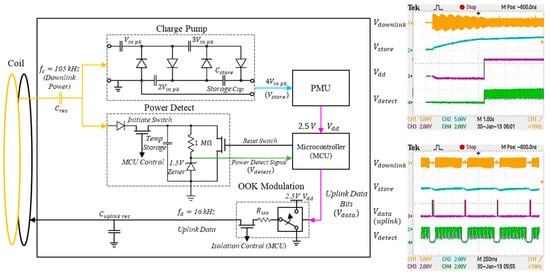 The OOK modulation circuit was implemented using two MCU-controlled FET-based switches and supplied by the 2.5 V supply output from the PMU. The isolation control switch prevents interference from the uplink circuitry to the downlink power transmission, and also with the isolation resistor (Riso) prevents the rapid draining of the energy storage capacitor through the coil during uplink data transmission. The second double-throw switch toggles the uplink data coil between the 2.5 V supply (Vdd) and ground in sync with the uplink data generated by the MCU. The measured voltages at these different sub-blocks of the tag circuitry at cold start during downlink power transmission and uplink data transmission are also shown in Figure 6.