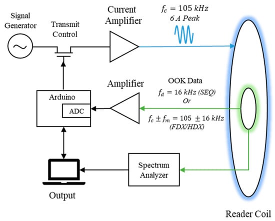 Conventional FDX/HDX RFID tags are widely used and commercially available. For the purpose of this research a comparable FDX/HDX communication tag was designed similar to the conventional tag design shown in Figure 3 which uses load modulation. The same coils were used for the SEQ and FDX/HDX RFID tag and reader systems with the tuning capacitor optimized for each RFID’s uplink data frequency. The carrier and data frequencies during the downlink carrier and uplink data transmission were set at 105 kHz (fc) and 16 kHz (fm, fd), respectively. To eliminate potential losses in the downlink power’s AC/DC conversion, the FDX/HDX tags were externally powered with 2.5 V during communication comparison tests. An MCU-controlled low-loss switch was used to toggle a resonating capacitor across the tag coil in sync with the data.