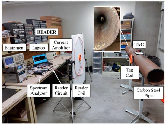 A common reader to test both the RFID systems on pipelines was implemented using RF equipment and discrete commercial off-the-shelf components as shown in Figure 7. The reader uses an Agilent 33120 function generator and an Accel TS 250 current amplifier with a 0.4 m radius 14 turn coil to generate a 6 A peak waveform for downlink wireless power transmission to the tag. The uplink data that is received from the tag is amplified by a voltage amplifier and then demodulated and decoded using an Arduino Due 32 bit processor with a 86 MHz clock and a built-in 12 bit ADC (ADC speed 1000 ksps). The uplink data is also alternatively fed into a Tektronics RSA 306B spectrum analyzer to study the spectral characteristics of the uplink data signal received from the SEQ and FDX/HDX tags with and without the pipe. The downlink power transmission and uplink data reception are controlled by the Arduino Due process with a USB-connected computer used for data processing. The tag and reader prototypes were built using discrete parts and assembled using breadboards and surface mount (SMT) adapters. The measurement setup of the reader and tag in the vicinity of the pipe is shown in Figure 8. The tags were attached directly to the pipe.