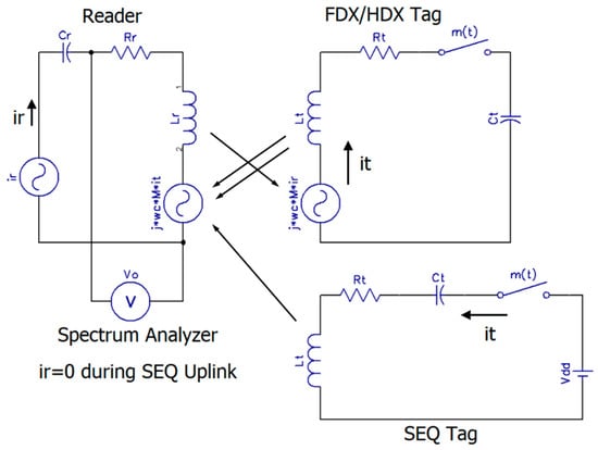 The current in the tag (it) at the higher carrier frequency fc is induced by the reader current (ir). It (it) is further modulated with data bits using the PIC microcontroller in the tag using on-off-keying at a data frequency fm as shown in Equation (5). The second term in Equation (5) represents the Fourier series co-efficient of m(t), i.e., the binary pulse modulation of the tag current by the PIC.