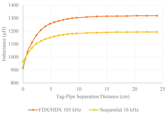 The extent of detuning in the inductance of the tag coils during uplink data transmission in both RFIDs is shown in Figure 11. The inductance variation is most significant when in very close proximity to the pipe (approximately 0–10 cm) with significantly more variation in the FDX/HDX RFIDs uplink data frequency band compared to the SEQ RFID. The tag coil inductance (Lt + ΔLpipe) drops from 1.31 to 0.91 mH for tag–pipe distance of between 10 cm or higher and 0 cm reflecting a net decrease of 0.4 mH (ΔLpipe) in the FDX/HDX uplink data communication frequency band of around 105 kHz. By comparison, the same tag coil used for SEQ RFID shows a drop from 1.19 mH to 0.96 mH over the same tag pipe separation distance with a net drop of only (ΔLpipe) 0.23 mH around the SEQ uplink data communication frequency band of 16 kHz.