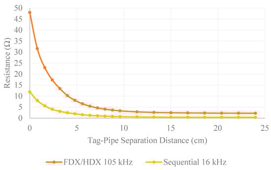 At high frequencies, the AC resistance of the tag coil is also higher due to skin depth losses and magnetic proximity effects due to nearby AC current flow. Skin depth losses in the tag coil were minimized by using multi-strand Litz wire. However, magnetic proximity effects on the tag coil due to the pipe were observed as shown in the AC resistance of the tag coil for SEQ and FDX/HDX RFIDs in Figure 12. Magnetic fields produced by AC current flow in the tags induce eddy currents in the adjacent metallic pipe walls. The magnetic field produced by these eddy currents also induce magnetic fields that hinder charge flow through the tag coil, thereby increasing its AC resistance. Additionally, in the case of the FDX/HDX RFIDs, the magnetic fields produced by the simultaneously on 105 kHz downlink transmission also marginally increases AC resistance of the tag coil at close range. This AC resistance is induced in series with the tag coil’s low internal resistance and tag circuitry impedance and can significantly reduce the tag’s input voltage during downlink and also the tag current during uplink data transmission thereby limiting the downlink powering and uplink data communication range. The magnetic proximity effects of the ASTM A-53 steel pipe on the tag coil at FDX/HDX and SEQ uplink frequencies were empirically measured as shown in Figure 12. Both RFID systems experience similar magnetic proximity effects of the pipe during downlink power transmission. However, for the uplink, the FDX/HDX tag’s AC resistance (Rt + ΔRpipe) increased from 2.2 to 48 ohms an increase of 45.8 ohms (ΔRpipe). By comparison the SEQ RFID tag coil’s AC resistance increased from 0.37 to 14 ohms as shown in Figure 12.