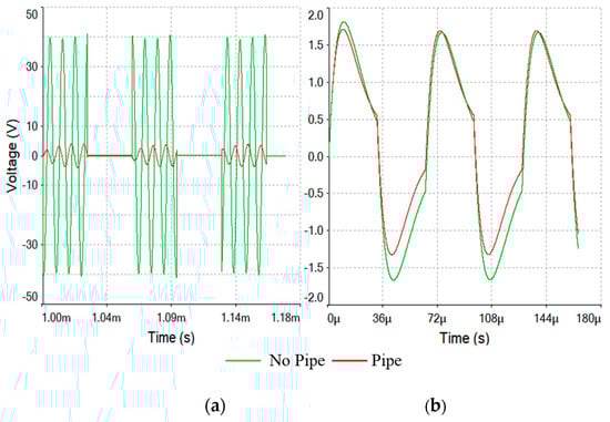 Simulated effects of the pipe on tag coil voltages at 80 cm separation distance between reader and tag. Downlink power increased for FDX/HDX to ensure similar power level is received on reader side as SEQ. (a) FDX/HDX tag coil voltage; (b) SEQ tag coil voltage.