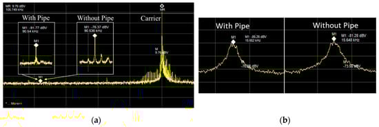 Measured spectrum plots of the uplink data communication signal at a reader–tag distance of 80 cm with and without pipe for: (a) FDX/HDX RFID communication system; (b) SEQ RFID communication system.