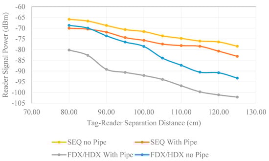 Measured reader received signal power level vs tag–reader separation distance for FDX/HDX and SEQ RFIDs with and without pipe effects.