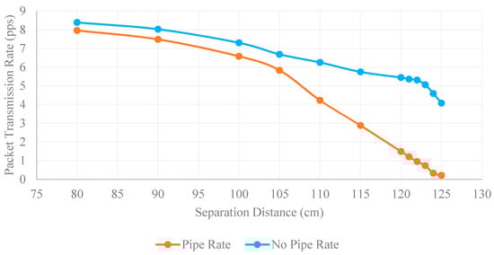 Over an increasing separation distance of between 80 and 125 cm, both RFIDs experience attenuation due to propagation loss. Over the same increasing range, the uplink data signal power measured on the reader side decreases from −69 to −93 dBm for the FDX/HDX RFID system without the pipe. By comparison, the received uplink data signal measured between −65.8 and −78.4 dBm over the same range for the SEQ system without the pipe as shown in Figure 15. However, with the presence of the pipe (tag–pipe separation distance = 0 cm), the uplink data signal was measured to be between −80.2 and −140.1 dBm over the same range registering approximately a 11.54 dBm drop for the FDX/HDX RFID system. By comparison, the uplink data signal dropped to between −70 and −83.1 dBm under the same conditions for the SEQ RFID registering approximately a 3.28 dBm drop over the full range due to pipe effects.