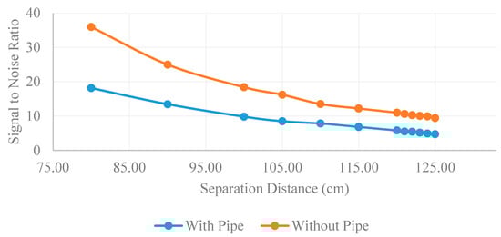 The signal-to-noise ratio of the data signal was measured on the reader side with the Arduino Due after amplification using the variance of the on and off signals. The on signal is measured by measuring the variance of a binary ’1’, and the off is measured by the variance of a binary ’0’ as this is essential noise as shown in Equation (11). The SNR of the SEQ system over a range of 80 to125 cm between reader and tag with and without pipe are shown in Figure 18. Essentially, the pipe halves the SNR of the system (−3 dB) which is comparable to the 3.28 dB drop presented in the communication tests in Figure 15.