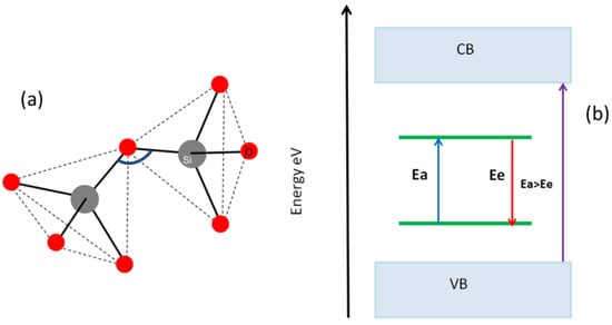 (a) Model of two SiO2 basic units []; (b) Simplified representation of the energy levels of a point defect absorbing (blue arrow) and emitting (red arrow) light at energies lower than the band gap (violet arrow) between valence (VB) and conduction (CB) bands.