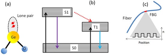 (a) Structural model of germanium lone pair center (GLPC); (b) Energy levels scheme of GLPC showing the absorptions due to S0–S1 and S0–T1 transitions (black arrows), the emissions due to S1–S0 (violet arrow) and T1–S0 (blue arrow) and the non-radiative transition named intersystem crossing (red dashed arrow); (c) representation of a FBG (fiber Bragg grating), which consists of a periodic alteration of the refractive index.