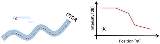 (a) Optical time domain reflectometry (OTDR) and fiber basic working configuration, the yellow dashed line stands for the pulsed excitation laser injected in the fiber, while the red dashed arrow represents the signal (Rayleigh, Raman, Brillouin) back-scattered by different points of the fiber. Each excitation is followed by back-scattered signals that reach the OTDR with different temporal delays related to the distance from the OTDR allowing the spatially distributed monitoring; (b) Typical OTDR trace recorded in a fiber that features different radiation-induced attenuation (RIA), such as for example as a consequence of a difference in the absorbed dose. The Lambert–Beer law allows evaluating the RIA, and in P-doped fiber, the dose [].
