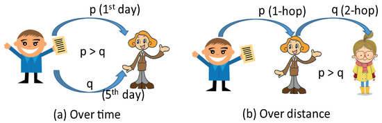 Examples of decaying diffusion rate of information. (Initial diffusion rate p and decayed rate q: (a) over time and (b) over distance.)