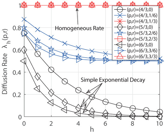We see that this form is parameterized by r. For example, if then it becomes the simple exponential decay as in Definition 1. If then it becomes which is the homogeneous diffusion rate. We plot the rate function with various values of parameters in Figure 2. Using this, we obtain the following result.