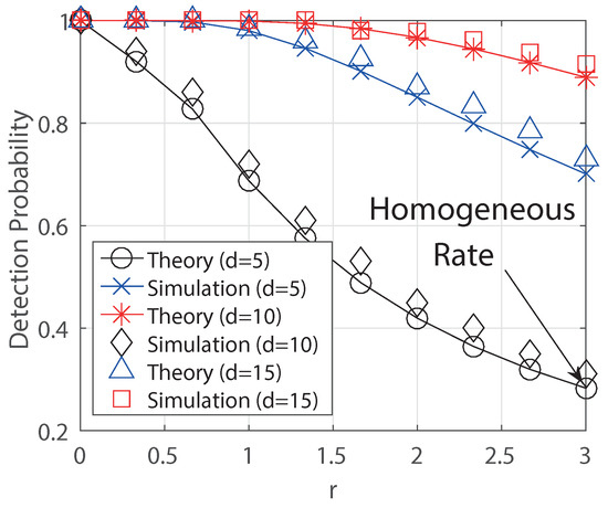For the regular tree, we first plot the theoretical result (asymptotic detection probability) in the Theorem 3 numerically with respect to the decay level r of the generalized decaying model in Figure 3. We have checked that the detection probabilities are almost one for (i.e., simple exponential decaying) and they decrease as t increases for three cases of degrees ( and ). We see that if for , it has the same detection probability to that of the homogeneous rate as our expectation. We further validate our theoretical result by simulation. We also check that the higher degree for the regular tree gives more chances to detect the source because it frequently has the best rumor centrality in the infection graph.