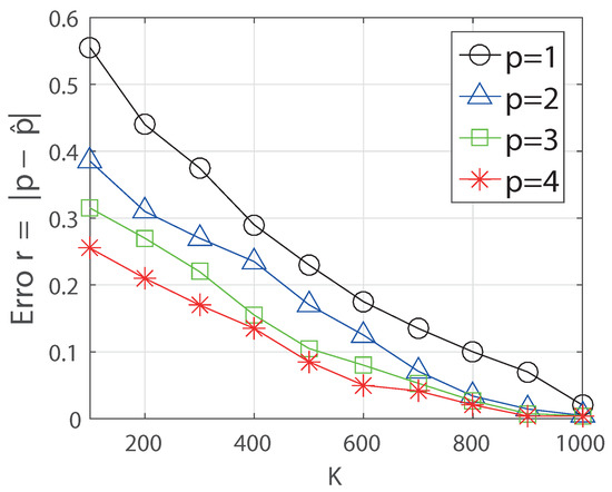 In Figure 4, we obtain the error of parameter estimation for p with respect to the sampling cost K for the algorithm DPE(K). We consider the case and we set the error between true parameter p and estimated parameter by using the distance . We plot the error for different values of p () by averaged values of 100 runnings of the algorithm. We use the step size and . In the result, we see that the algorithm DPE(K) estimates the true parameter more accurately when p is large. This is because a large decaying parameter makes the snapshot more balanced from the source, and this enables to estimate the true parameter with less fluctuation.