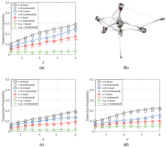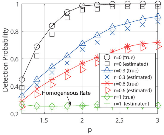 In Figure 5, we obtain the detection probabilities for degree with respect to decaying parameter p. In this simulation, we compare two results known parameter (true) unknown parameter (estimated), respectively. The known parameter means that the true decaying parameter is given a prior, and we use it in the simulation. The unknown parameter means we do not know the true parameter so that we need to estimate it using the algorithm DPE(K) first. Then we obtain the detection probability. In the result, we check that the detection probability increases as p increases and the reduction of detection performance is not much even though we use the estimated parameter using DPE(K) for .